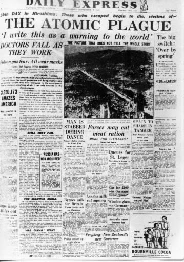 - The newspaper the soldier was reading is “Daily Express”, dated September 5th, 1945. The headline: “30th Day in Hiroshima: Those who escaped begin to die, victims of – The Atomic Plague”. Picture.