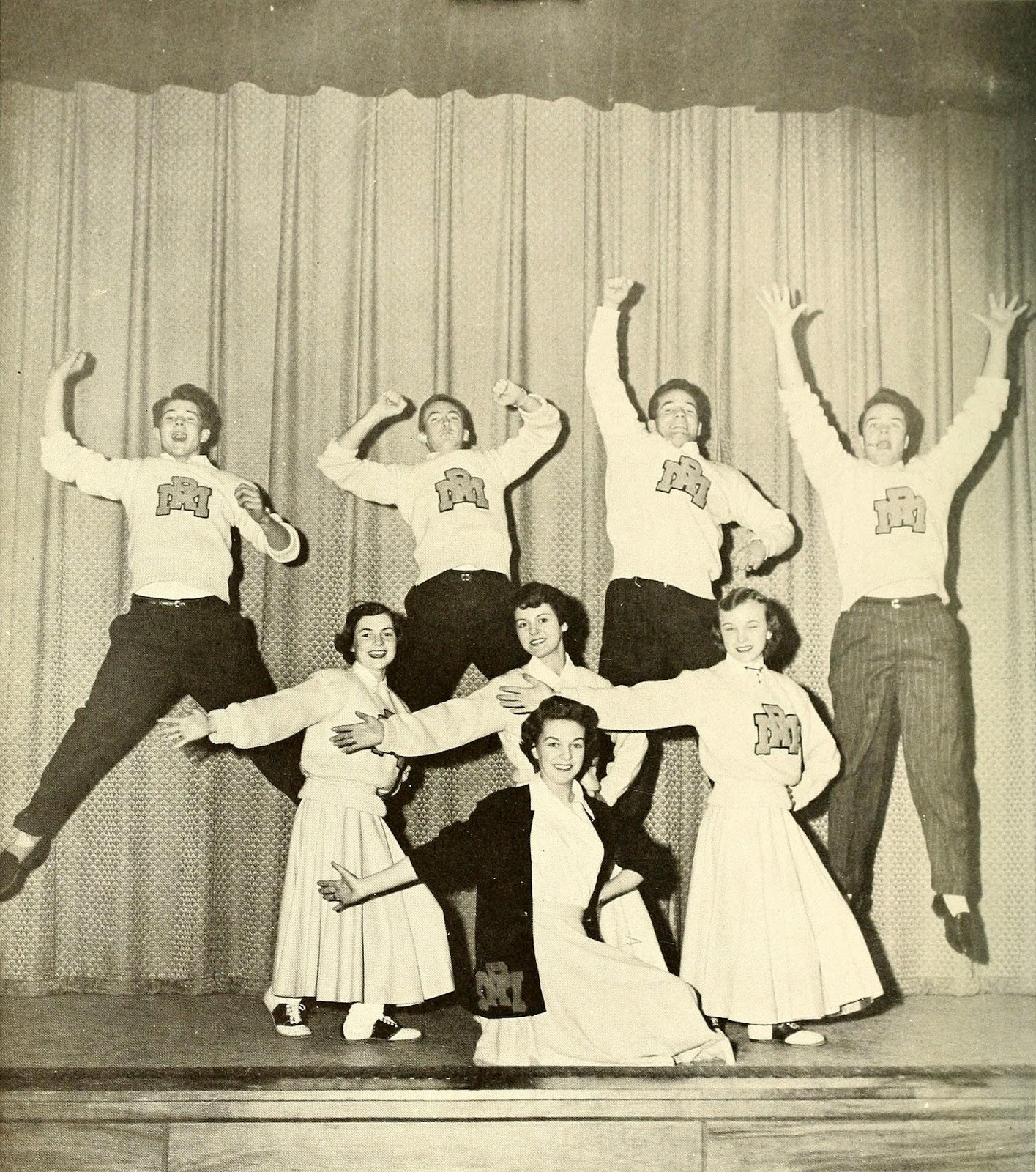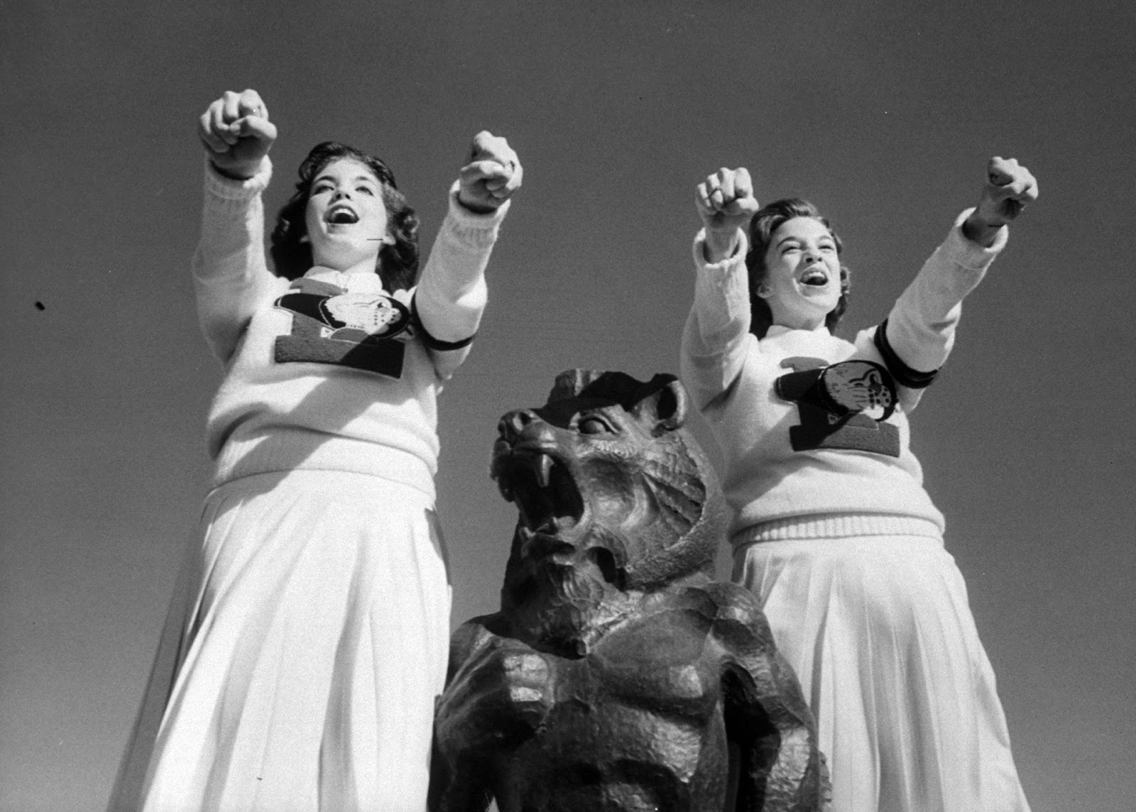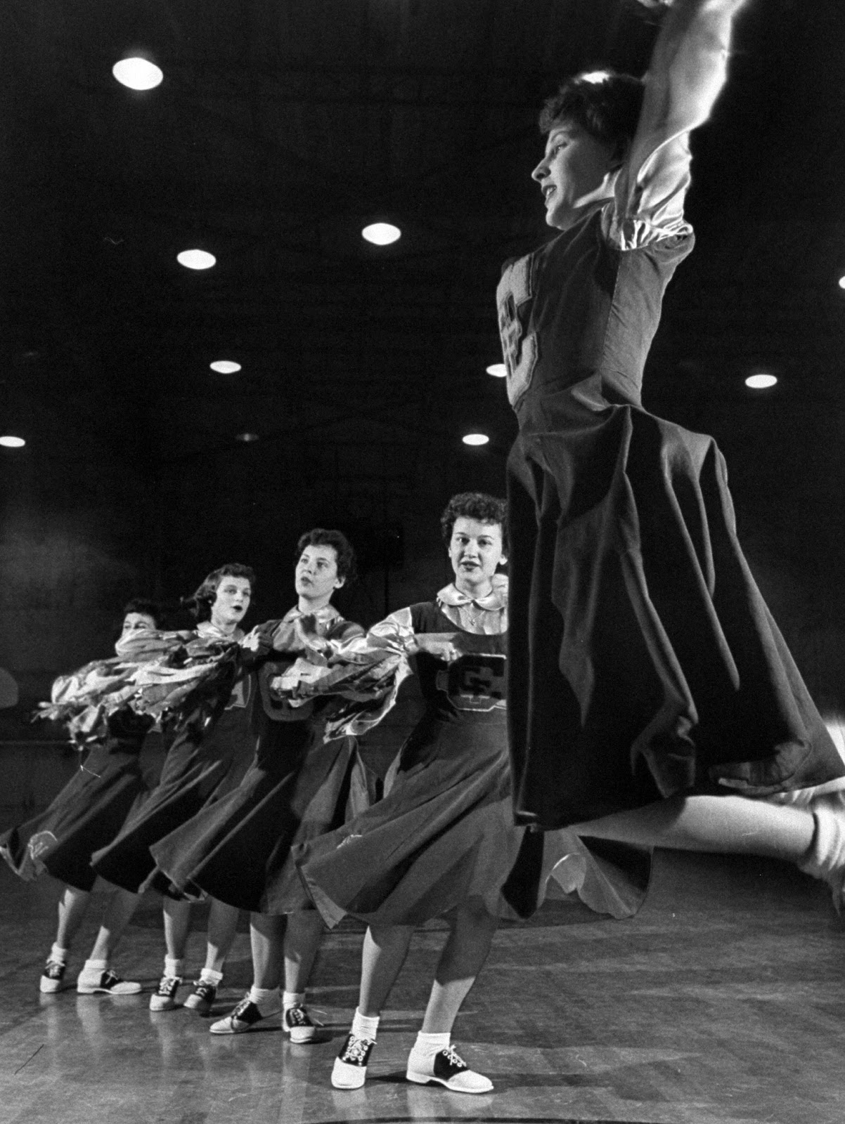 High school girl cheerleaders wearing sweaters and skirts leaping high in the air during their vigorous cheers at the basketball game, 1953. (Francis Miller—The LIFE Picture Collection.)