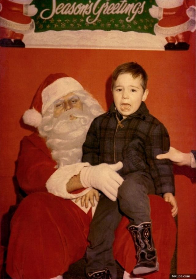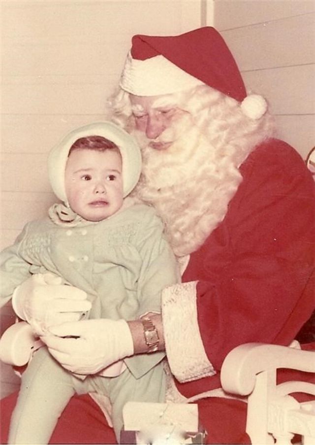 In many photos, Santa towers over children who look confused, frightened, or on the verge of tears.