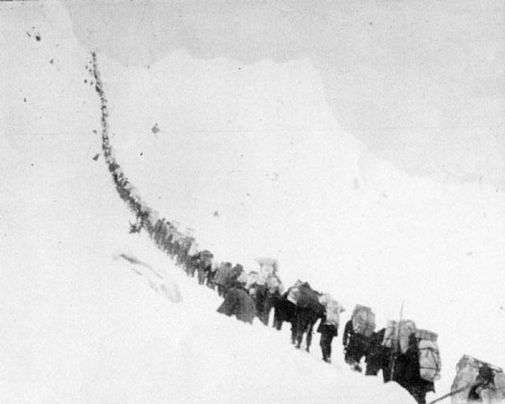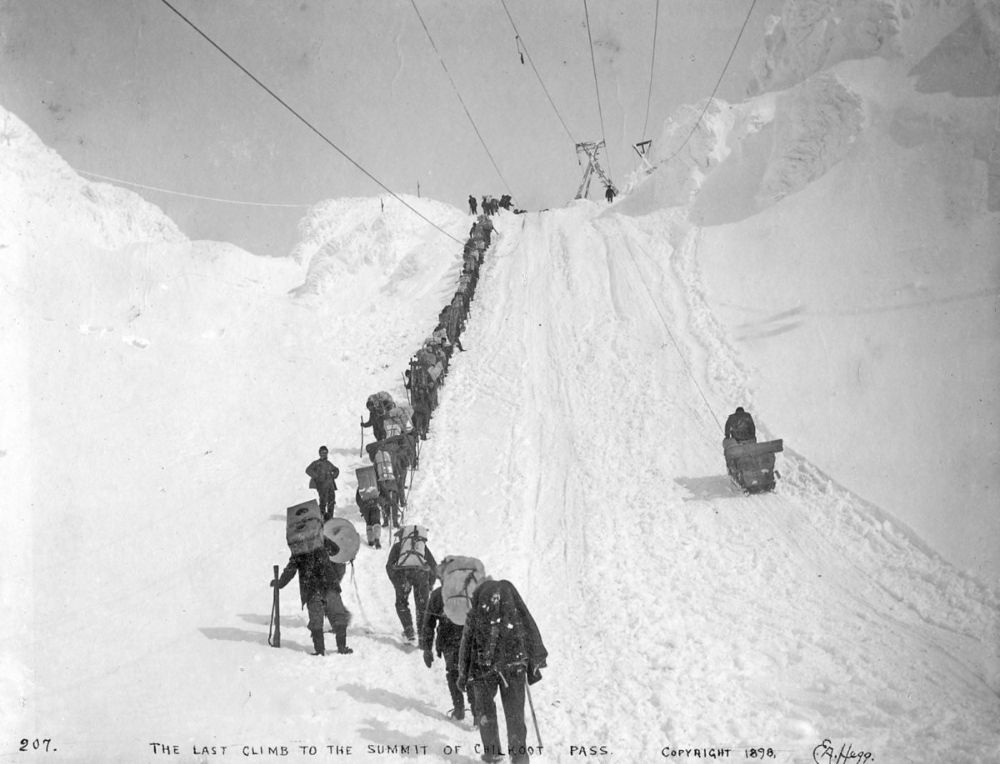 The Canadian authorities required each of them to bring a year’s supply of food, in order to prevent starvation. In all, the Klondikers’ equipment weighed close to a ton, which most carried themselves, in stages.