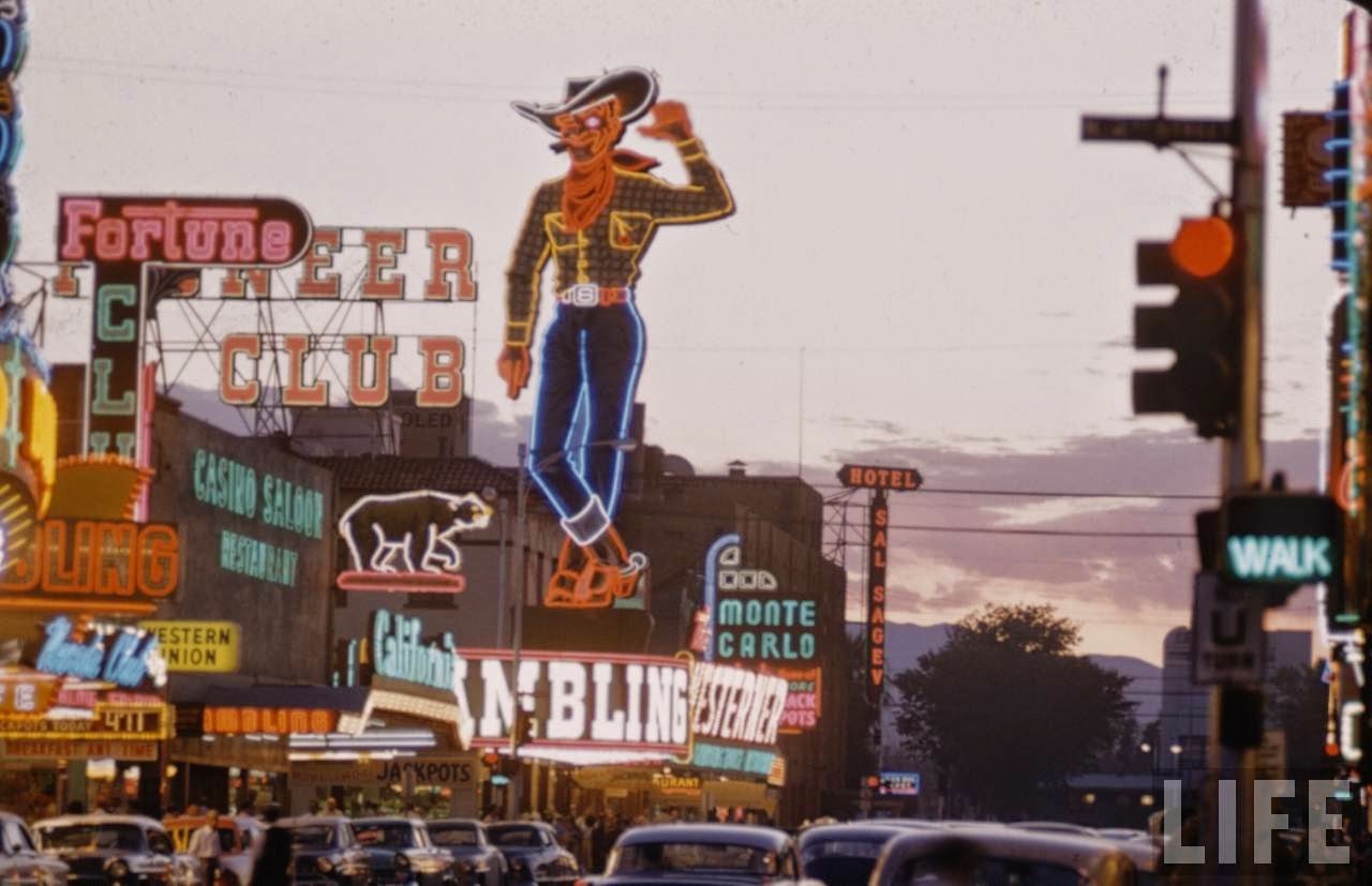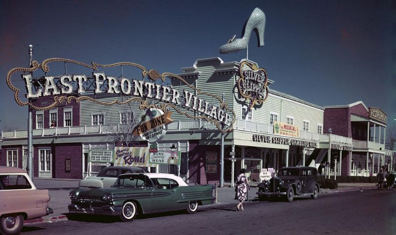 The sign moved its arms, winked, held a cigarette, and let out smoke rings. Its attire consisted of a cowboy hat, blue jeans, boots, a yellow checked shirt, and a bandana.The New Frontier Hotel was the venue of Elvis Presley’s first shows in Las Vegas from 23 April 1956. The 12-story tall Fremont Hotel and Casino located on 200 Fremont Street opened on 18 May 1956 and was then the tallest building in downtown Las Vegas for several years.
