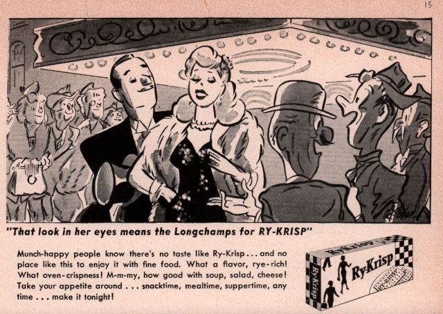 Several 1940s Ry-Krisp ads were drawn by popular cartoonists from the New Yorker magazine. Ry-Krisp was a sponsor of 1940s radio shows featuring famed New York hostess Elsa Maxwell and opera star Marion Talley.