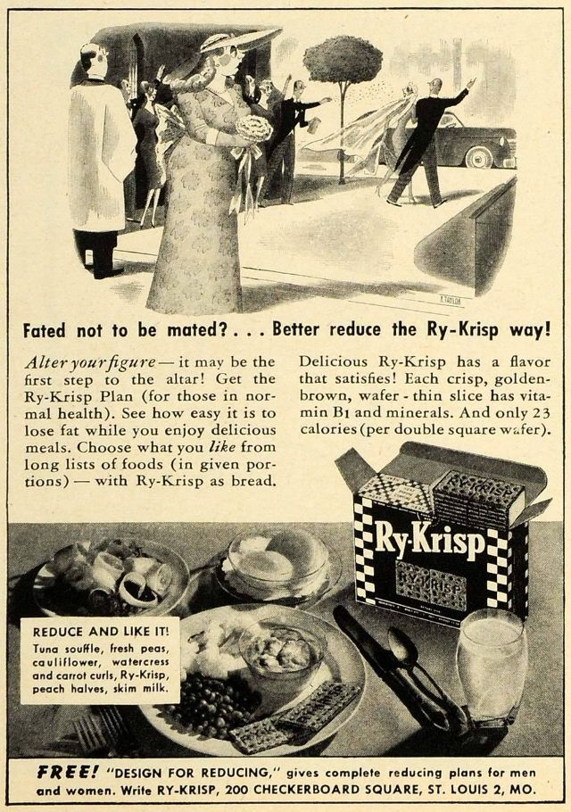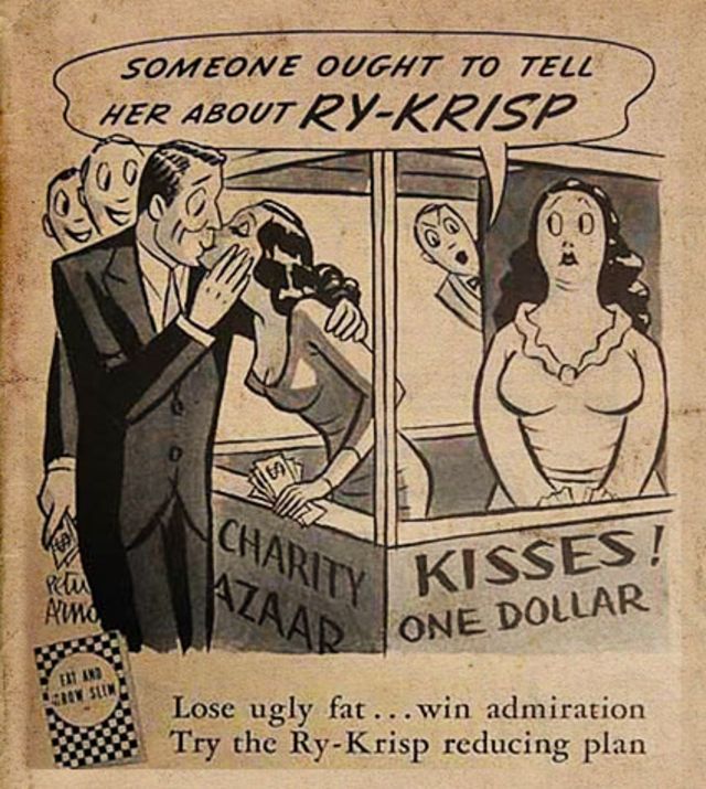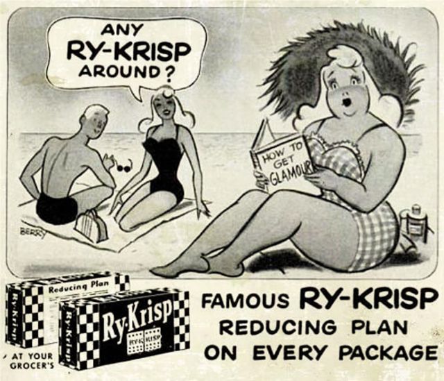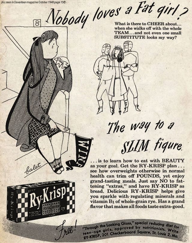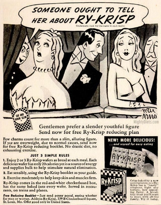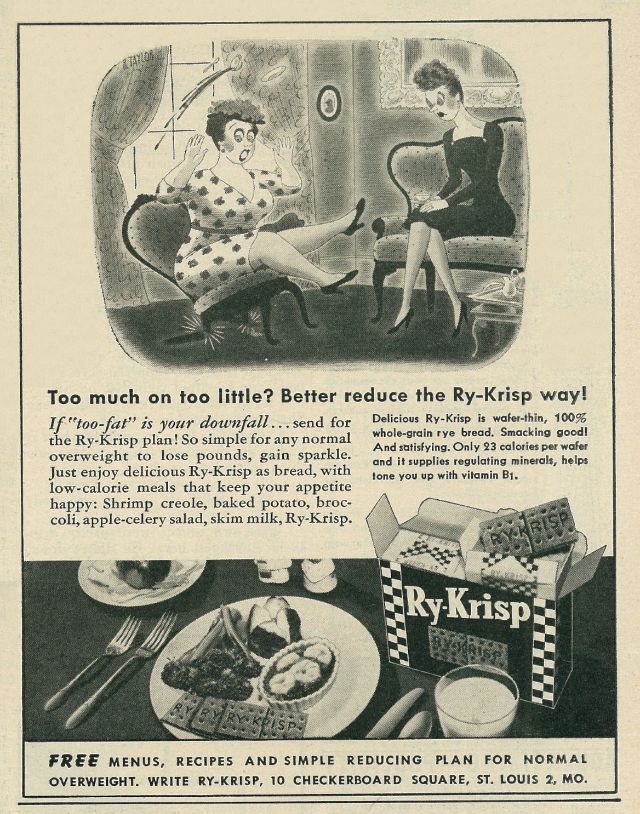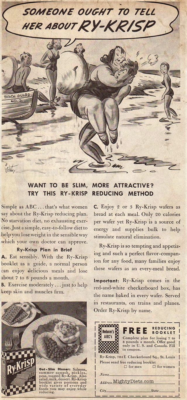 For years they even ran ads like, “Nobody loves a fat girl,” in Seventeen magazine. In this article, we’ve collected offensive, fat-shaming vintage magazine advertisements from the 1930s, 1940s, and 1950s for Ry-Krisp crackers.