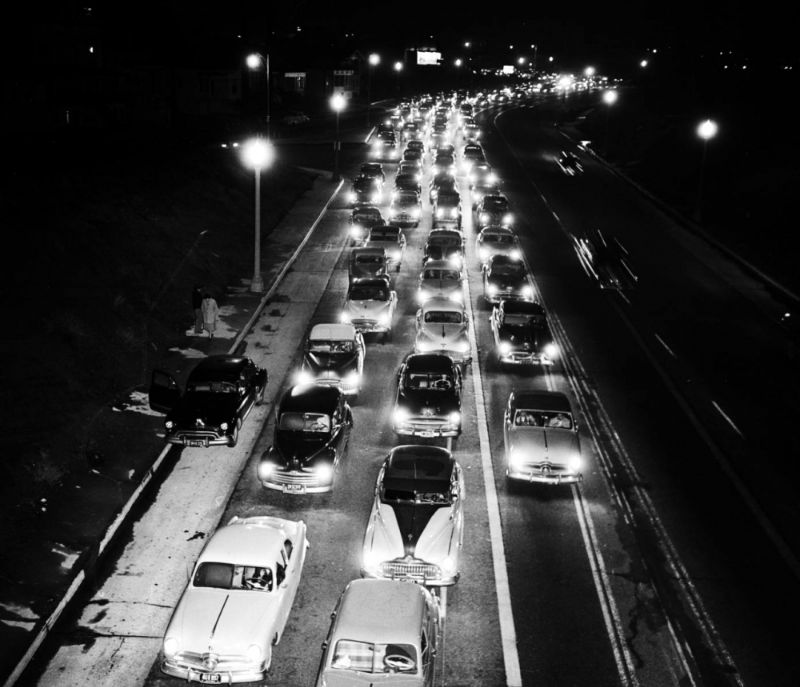The rise of commuting created daily bottlenecks on bridges and arterial roads. One of the most iconic images of this era is the 1950 Thanksgiving weekend traffic jam on U.S. Route 40, where cars were reportedly backed up for miles as families traveled for the holiday.