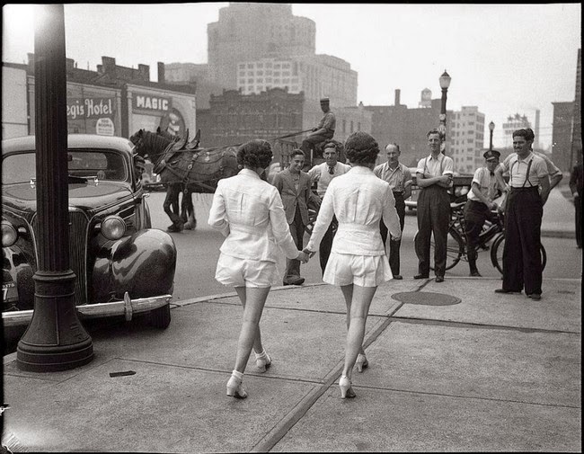 Two women show uncovered legs in public for the first time in Toronto, 1937.